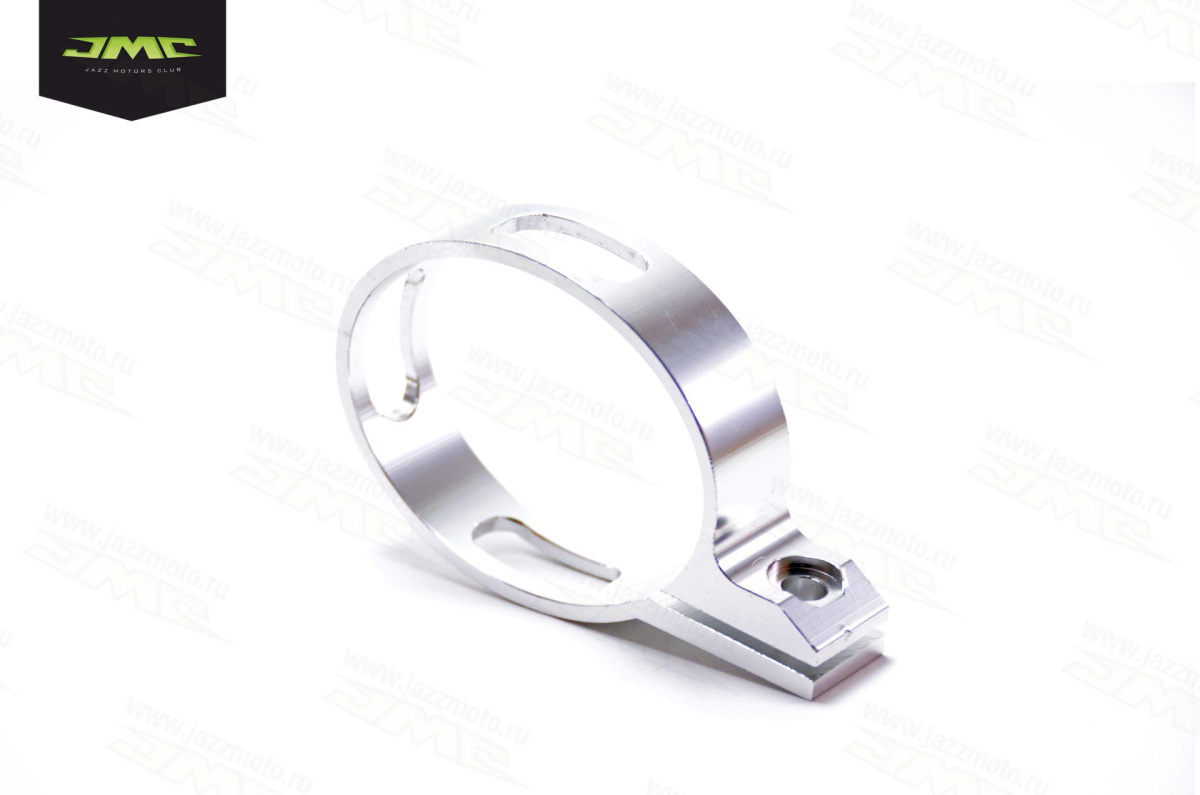 Хомут глушителя эллипсной формы. Прочно фиксирует положение глушителя.  Материал – алюминий. Размер отверстия для глушителя – 8,55 х 6,60 см. Толщина хомута – 24 мм. Диаметр крепления – 8,6 мм.