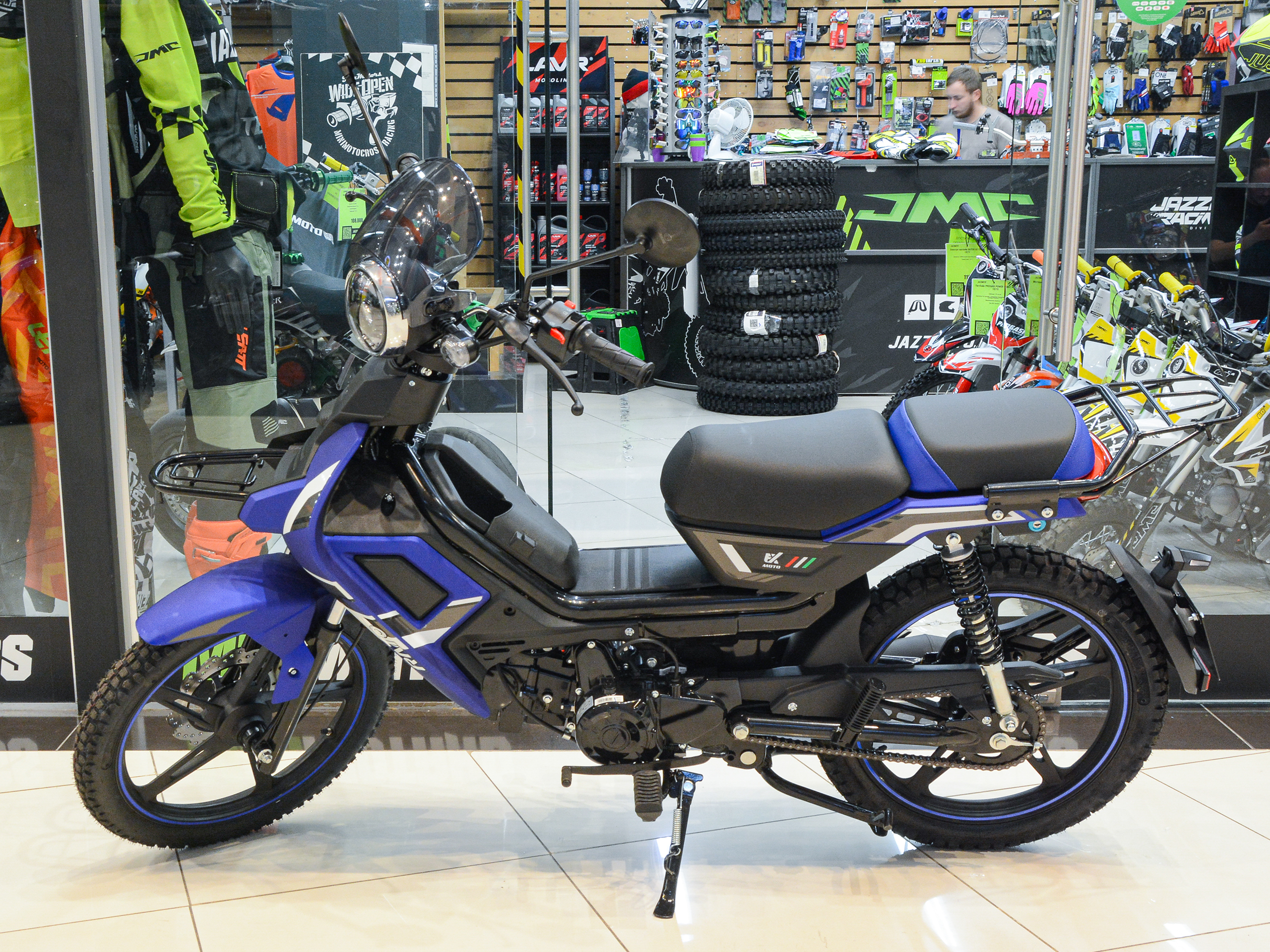 Скутеретта FX 50cc на ДВС, 110 сс двигатель (9 л/с), воздушное охлаждение. Новый дизайн модель 2023 года обновленная, новый электронный щиток приборов. Тормоза перед диск. зад  барабанные. Полностью диодная фара головного света, диодный задний фонарь и повороты. Новые диски, кофр, багажные сумки, ветровое стекло. Шина перед 2,50/17, шина зад 2,75/17. Цвет:  Синий.