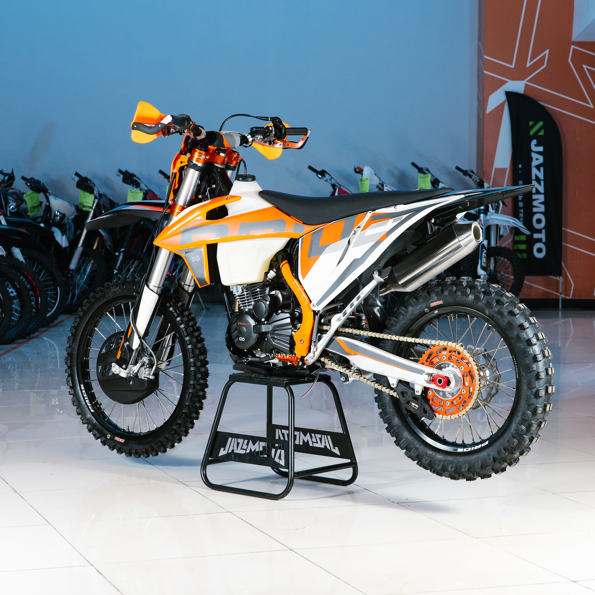 Спереди и сзади установлены антибуксаторы бренда "AJ1", которые притягивают покрышку к ободу, позволяя ездить по бездорожью при низком давлении в камерах, не давая покрышке проворачиваться во время езды. Размер передней покрышки: 80/100 R21. Размер задней покрышки: 120/90-R18. Модель комплектуется "жирной" резиной "KENDA". Все эти характеристики позволяют мотоциклу отлично себя чувствовать в песке и грязи.