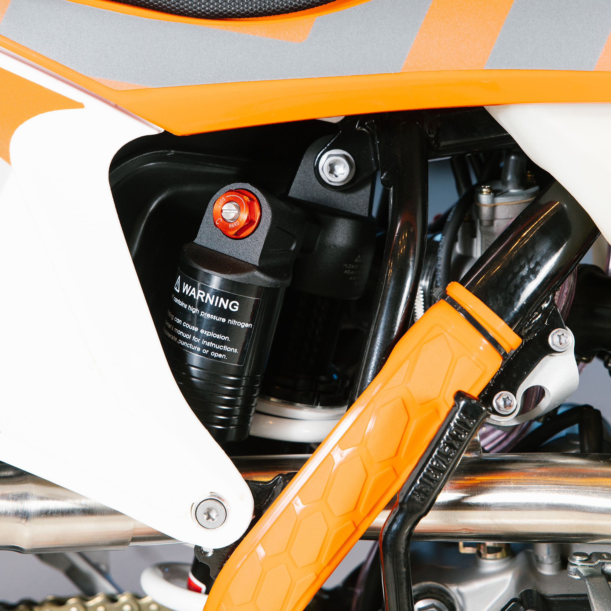 Передняя вилка "MNT" перевернутого типа T7 48- 910mm с регулировкой на сжатия и отбой. Моноамортизатор "MNT" также с регулировками. Система прогрессии, обеспечивает равномерную, мягкую работу и увеличивает длину рабочего хода подвески. Также ось крепления маятника совпадает с осью крепления ножки. Это существенно улучшает развесовку мотоцикла.