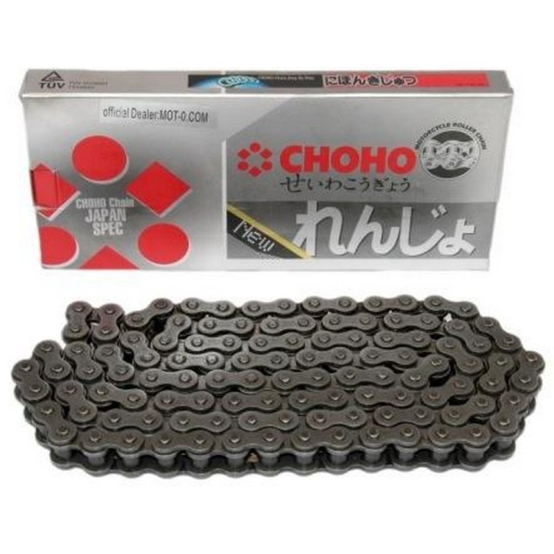 Приводными цепями Choho комплектуется мототехника именитых брендов таких, как: HONDA, SUZUKI, YAMAHA, PIAGGIO и другие. Втулки цепей имеют специальное Хром-Ванадиевое покрытие, которое обеспечивает повышенную прочность, защищает от износа, перегрева и коррозии, а также снижает вероятность разрыва. Местное упрочнение шариком. Прохождение шарика через отверстие в пластине придают ей местное упрочнение, обеспечивая максимальную устойчивость к усталостному разрушению. Повышенная устойчивость к усталостному разрушению достигается также за счёт специальной дробеструйной обработки цепи. Четырехсторонняя клёпка валика цепи. Улучшенная фиксация валика с пластиной достигается благодаря специальной четырёхсторонней клёпке валика. Также она дополнительно защищает валик от прокручивания в пластине и на усилие выпресовывания валика. Использование специально разработанного вакуумного насоса создаёт отрицательное давление: так смазка проникает между всеми деталями цепи, а значит, её износ значительно снижается, увеличивая срок службы цепи на 30 процентов.Высокая стойкость на износ достигается благодаря особой термообработке, обработке поверхности втулки и штифта. К особенностям роликовых цепей Choho относятся следующие их достоинства: Втулка изготавливается из легированной стали 20CrMnMo 20ХГМ, в разы увеличивающей срок службы цепи. Ролик выполняется из углеродистой стали 10, устойчивой к серьёзным ударным нагрузкам. Валик производится из легированной стали 30 Cr Mn Ti 30ХГТ и имеет высочайшую прочность на разрыв. Пластина, сделан из легированной, марганцовистой стали 45Mn 45Г, устойчива к усталостным нагрузкам.  Высокая степень износостойкости достигается за счёт использования специальной смазки. Приводная цепь Choho подходит к абсолютно всем питбайкам с кубатурой от 110 до 190 куб.см., с размерностью звезд 420. В случае, если вам необходима цепь с меньшим количеством звеньев,, вы можете ее укоротить с помощью выжимки для мотоцепей.
