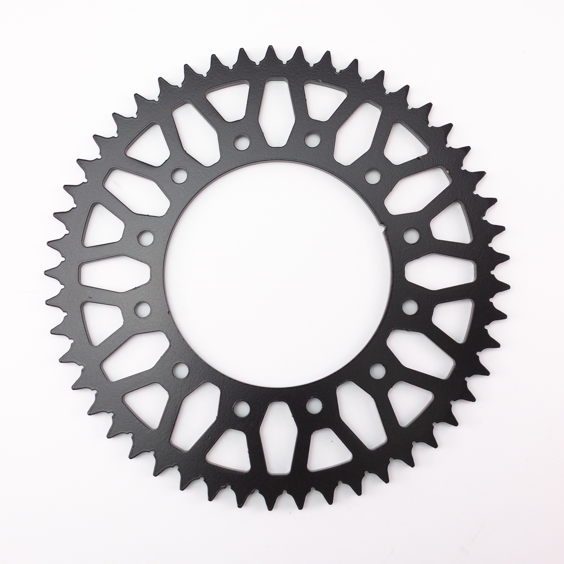 Звезда ведомая обеспечивает плавное и стабильное движение мотоцикла. Имеет грязевыталкивающие прорези, что обеспечивает самоочистку звезды, исключает растяжение цепи при использовании в условиях OFF-ROAD.
